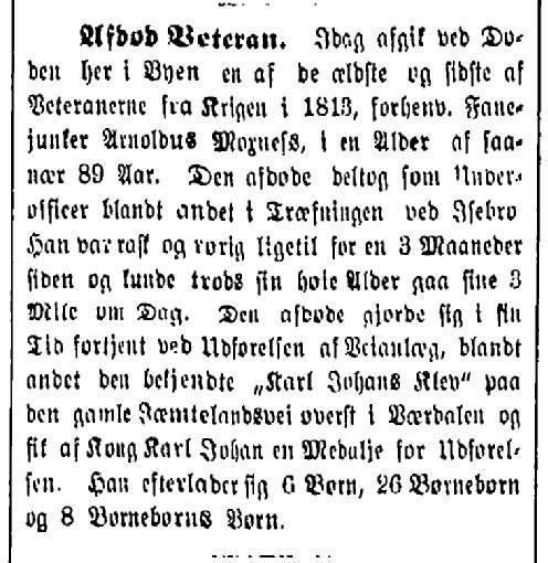 | "Afdød veteran. I dag afgik ved Døden her i Byen en af de ældste og siste av Veteranene fra Krigen i 1813, forhenv. Fanejunker Arnoldus Moxness, i en Alder af saanær 89 Aar. Den afdøde deltog som Underofficer blandt andet i Træfningen ved Isebro. Han var rask og rørlig ligetil for en 3 Maaneder siden og kunde trods sin høie Alder gaa sine 3 Mile om Dag. Den afdøde gjorde sig i sin Tid fortjent ved Udførelsen af Veianlæg blandt andet den bekjendte "Karl Johans Klev" på den gamle Jæmtelandsvei øverst i Værdalen og fik av Kong Karl Johan en Medalje for Udførelsen. Han efterlader sig 6 Børn, 26 Børnebørn og 8 Børnebørns Børn". |